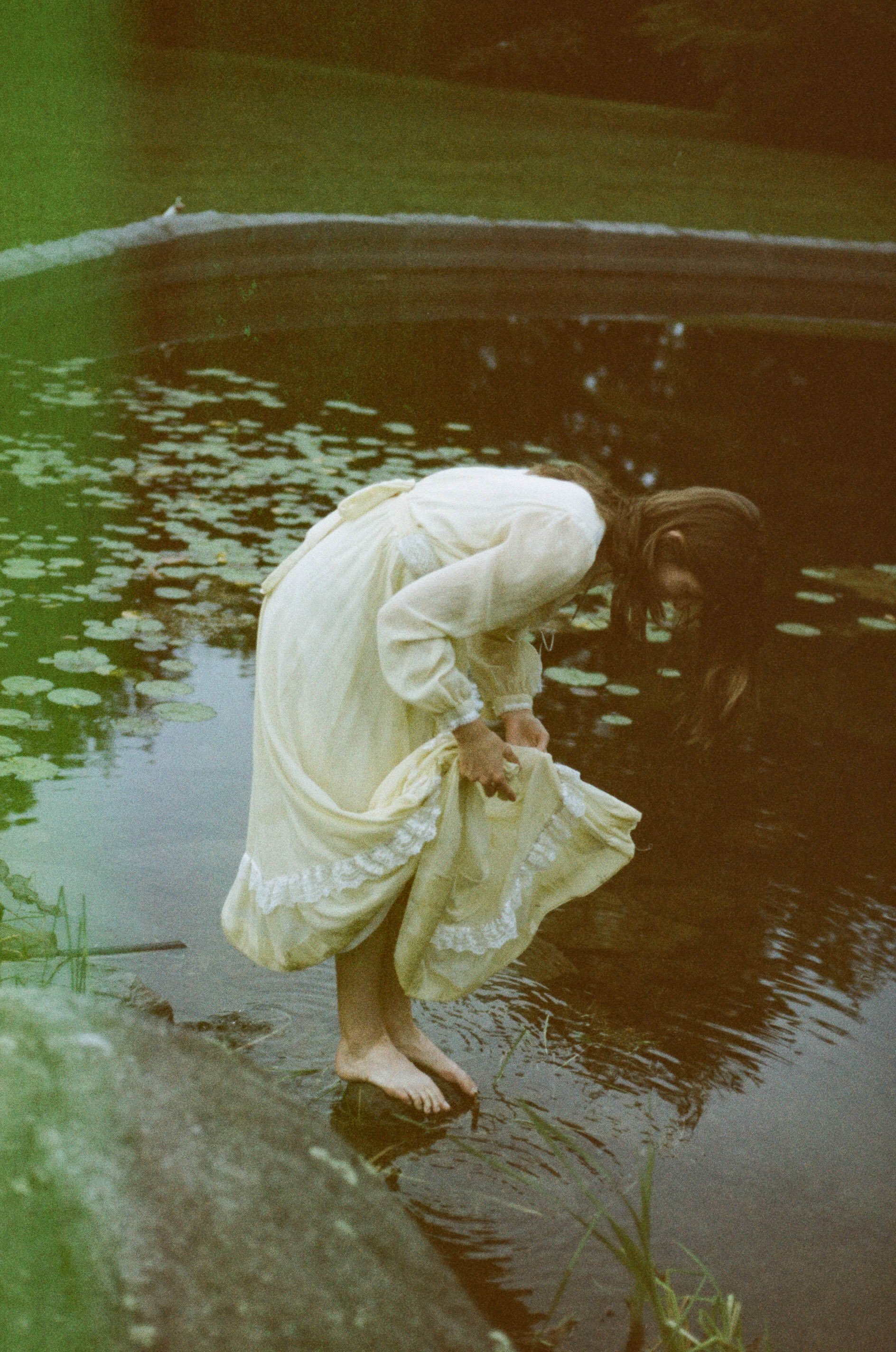 We began the session with Ella standing in a small pond, watching frogs jump and swim in the water. The scene was almost surreal—the pale dress against the dark water, the ripples breaking the surface, and the overcast sky reflected in the pond. The film’s green tint, coupled with the slow shutter speeds, gave the images a ghostly quality, as if Ella were both present and part of the garden itself.